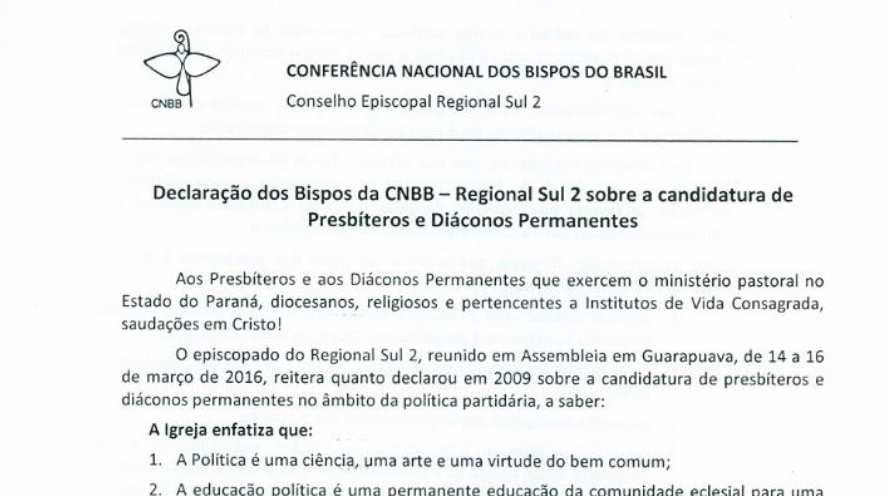 Bispos da CNBB do Paraná reafirmam serem contrários à candidatura de padres a qualquer cargo eletivo 17/03/2016 Leia Mais